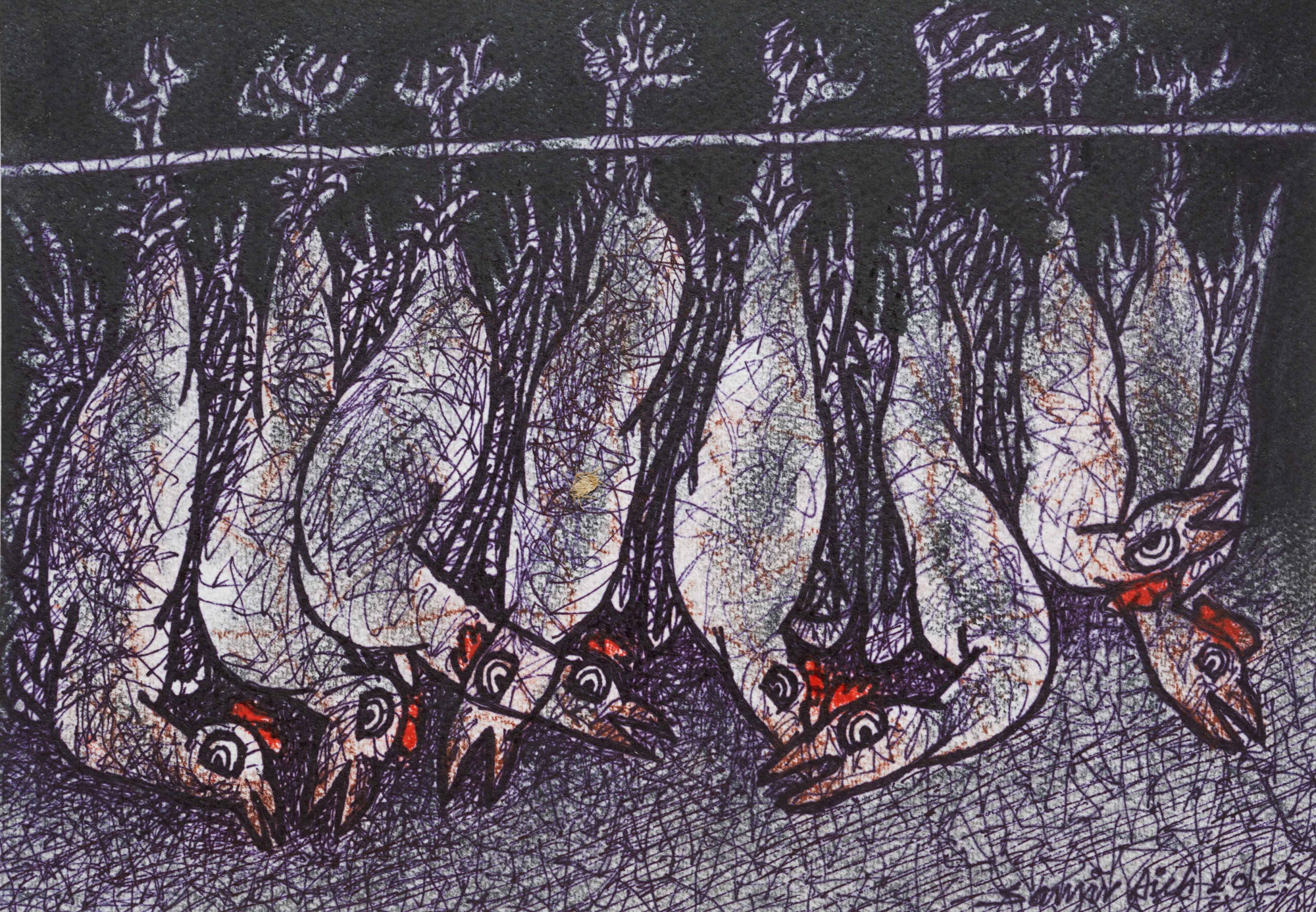 Dry Pastel, Acrylic, Conte, Pen, Ink and Brush on Acid free Fabriano Paper