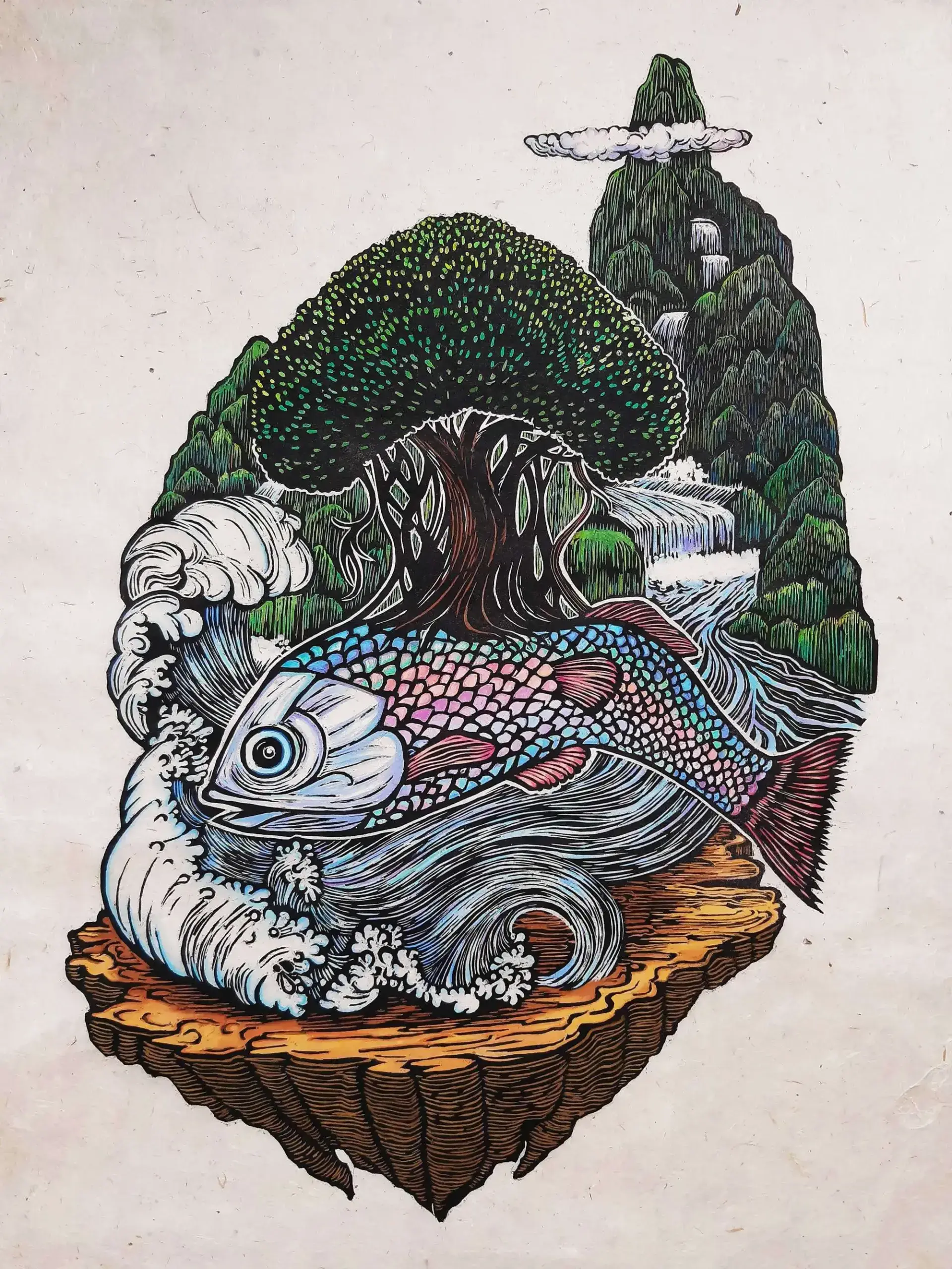 Unique Woodcut Print Handcoloured with Gouache on Rice Paper